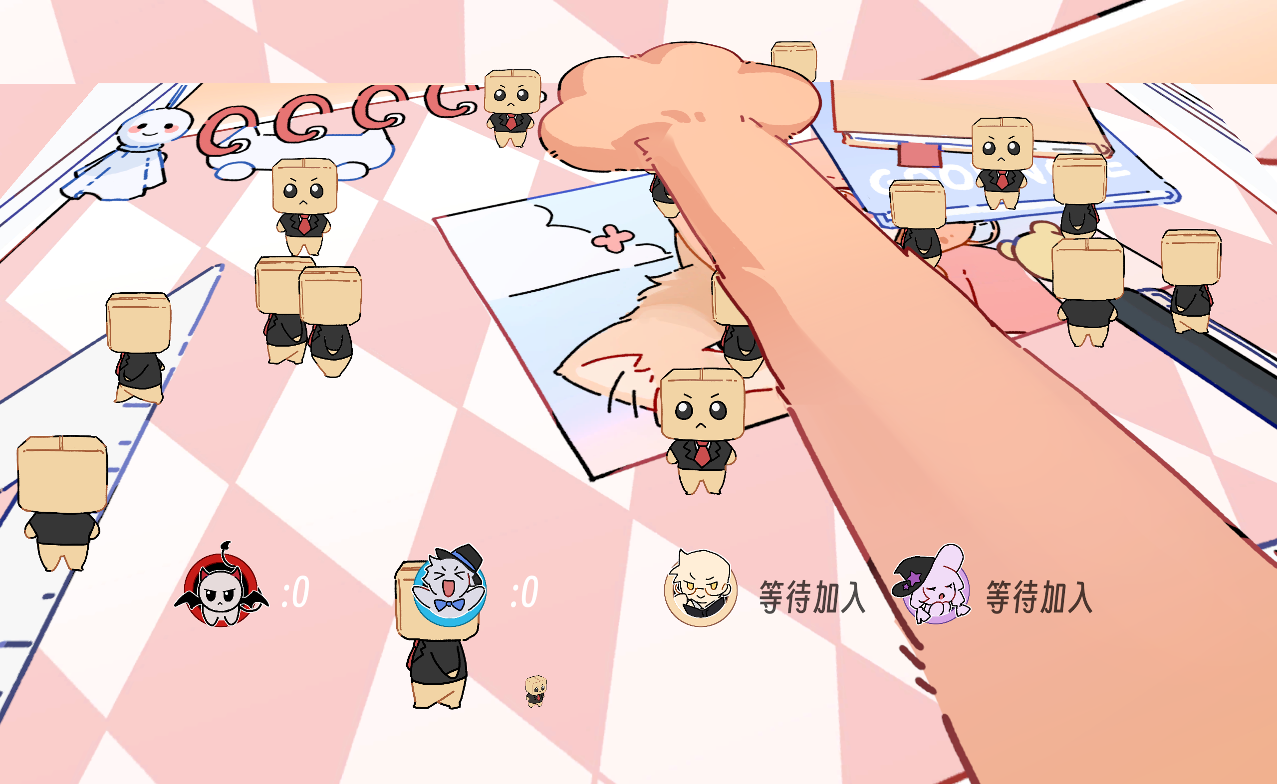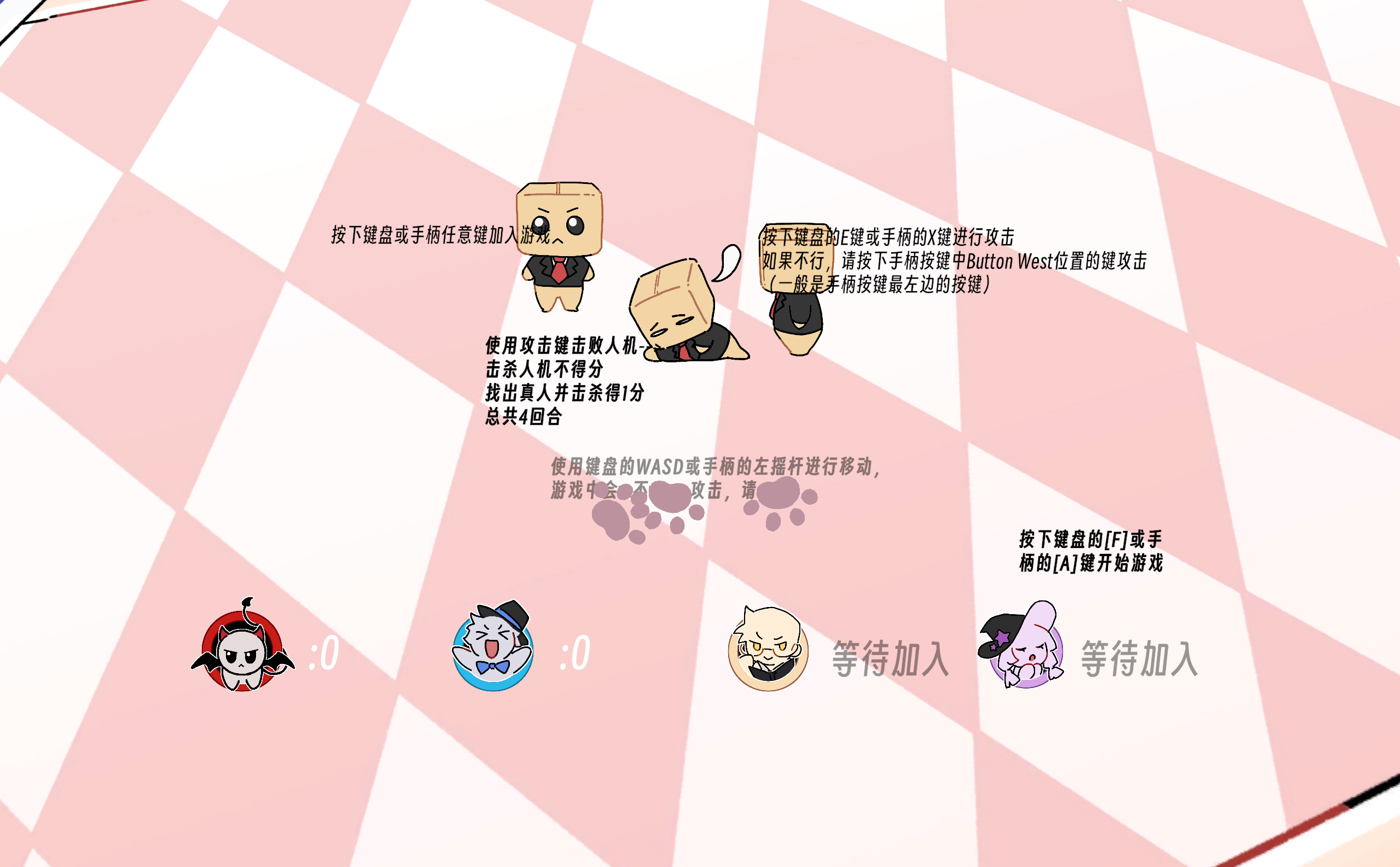 你将和你的朋友在NPC中周旋,防止对方在NPC中找到你并击杀,游戏支持2-4人游玩,至少为键盘+一个接收器(例如手柄),在多局中积累分数获得胜利把